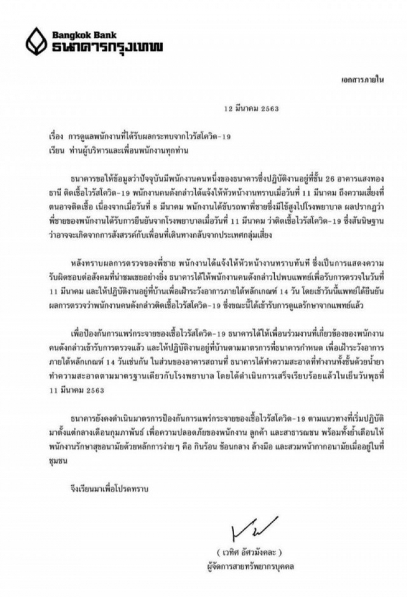 วันที่ 12 มีนาคม 2563 ธนาคารกรุงเทพ ออกเอกสารชี้แจง กรณีมีพนักงานติด CD19 โดยระบุใจความว่า ขณะนี้พนักงานของธนาคาร 1 คน ซึ่งปฏิบัติงานประจำ ณ อาคารแสงทองธานี ชั้น 26 ได้รับการตรวจและยืนยันจากแพทย์ว่าติด