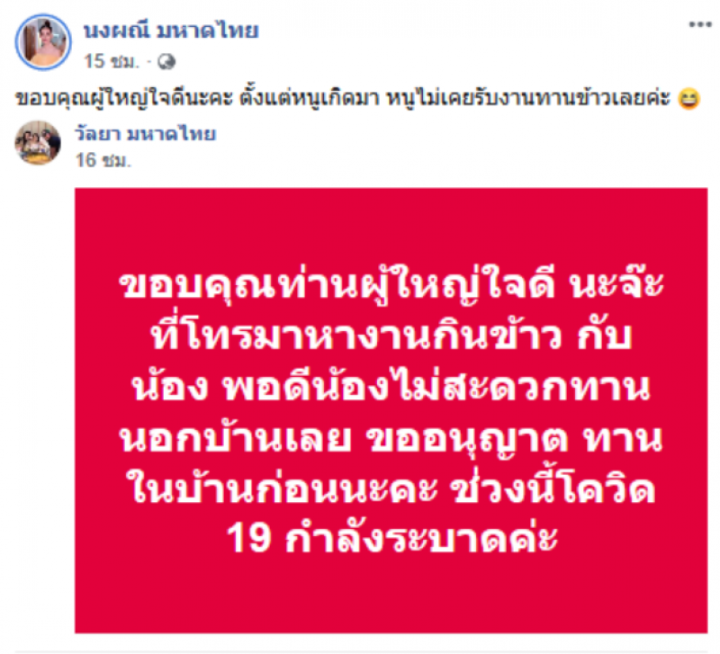 ล่าสุดสาวจ๊ะ โพสต์เฟซบุ๊กว่า มีผู้ใหญ่ใจดีติดต่อมาหางานกินข้าว แต่ทางผู้จัดการส่วนตัวของสาวจ๊ะ ได้บอกปฏิเสธว่าจ๊ะไม่สะดวกทานข้าวนอกบ้าน ขออนุญาตทานข้าวในบ้านก่อน ซึ่งสาวจ๊ะ ก็ได้บอกว่า ขอบคุณผู้ใหญ่ใจดีนะคะ ตั้งแต่หนูเกิดมา หนูไม่เคยรับงานทานข้าวเลยค่ะ