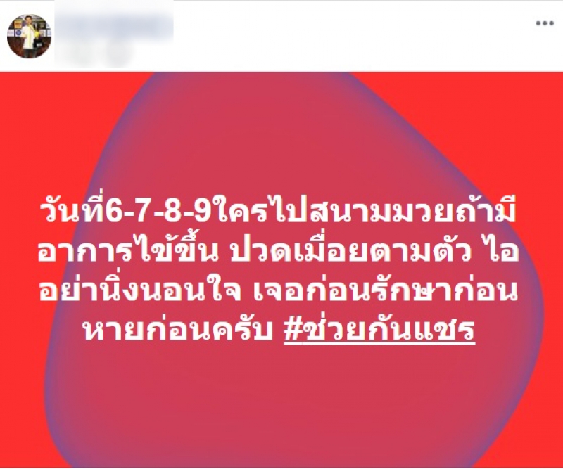 จากกรณีมีนักมวยรายหนึ่งโพสต์ว่าเป็น CO VID โดยเตือนให้คนที่ไปสนามมวยดัง ให้ระมัดระวังหากมีอาการให้รีบไปพบแพทย์โดยด่วน โดยพบว่านอกจากนักมวยรายดังกล่าวยังพบว่า มีนักมวยอีก 2 ราย โพสต์ว่าตนเองติด CO VID ด้วย