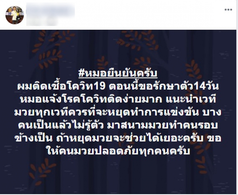 โดยทั้งสองเป็นนักมวยดังในวงการมวย คือ มีแน่ ศิษย์เส่ย และ หนุ่ม เดินสาย ได้ระบุว่า ผลการตรวจออกมาแน่ชัดแล้วว่าติด CO VID นอกจากนี้ยังได้ระบุว่า วันที่ 6 7 8 9 ใครไปสนามมวยถ้ามีอาการไข้ขึ้น ปวดเมื่อยตามตัว ไอ อย่านิ่งนอนใจ เจอก่อนรักษาก่อนหายก่อนครับ