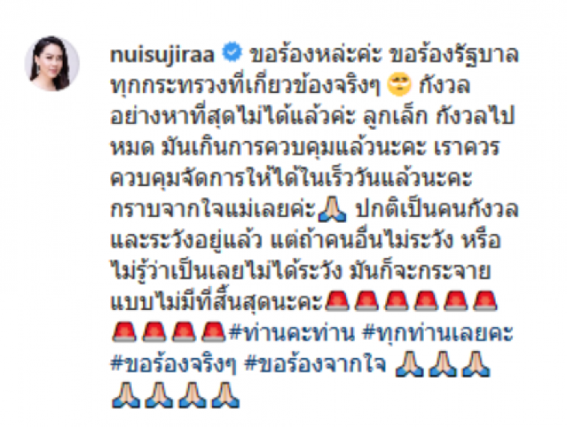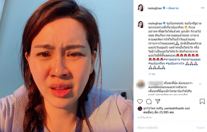 โดยล่าสุด สาวนุ้ย สุจิรา ได้โพสต์ข้อความลงอินสตาแกรมส่วนตัวระบุว่า ขอร้องหล่ะค่ะ ขอร้องรัฐบาลทุกกระทรวงที่เกี่ยวข้องจริงๆ กังวลอย่างหาที่สุดไม่ได้แล้วค่ะทุกคน กังวลไปหมด มันเกินการควบคุมแล้วนะคะ เราควรควบคุมจัดการให้ได้ในเร็ววันแล้วนะคะ กราบจากใจแม่เลยค่ะ ปกติเป็นคนกังวลและระวังอยู่แล้ว แต่ถ้าคนอื่นไม่ระวัง หรือ ไม่รู้ว่าเป็นเลยไม่ได้ระวัง มันก็จะกระจายแบบไม่มีที่สิ้นสุดนะคะ ท่านคะท่าน ทุกท่านเลยคะ ขอร้องจริงๆ ขอร้องจากใจ
