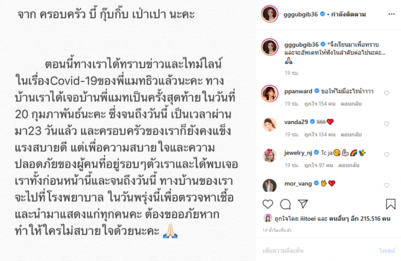 ล่าสุด สาวกุ๊บกิ๊บ ได้โพสต์รูปที่มีข้อความว่า จากครอบครัว บี้ กุ๊บกิ๊บ เป่าเปา นะคะ ตอนนี้ทางเราได้ทราบข่าวและไทมืไลน์ในเรื่อง CO VID ของพี่แมทธิวแล้วนะคะ ทางบ้านเราได้เจอบ้านพี่แมทเป็นครั้งสุดท้ายในวันที่ 20 กุมภาพันธ์นะคะ ซึ่งจนถึงวันนี้ เป็นเวลาผ่านมา 23 วันแล้ว และครอบครัวของเราก็ยังคงแข็งแรงสบายดี แต่เพื่อความสบายใจและผู้คนที่อยู่รอบๆตัวเราและได้พบเจอเราทั้งก่อนหน้านี้และจนถึงวันนี้ ทางบ้านของเราจะไปที่โรงบาล ในวันพรุ่งนี้เพื่อตรวจและนำมาแสดงกับทุกคน ต้องขออภัยหากทำให้ใครไม่สบายใจด้วยนะคะ