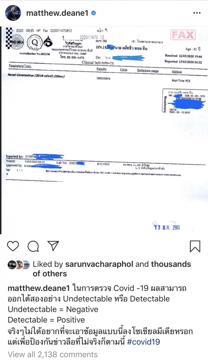 วันนี้ 14 มีนาคม โรงบาลพระราม 9 ได้ออกแถลงการณ์เรื่อง มาตรการคัดกรอง ป้องกันเพื่อความปลอดภัยของผู้รับบริการโรงบาลพระราม 9 ตอนหนึ่งระบุว่า เนื่องด้วยในวันที่ 13 มีนาคม2563 เกิดกรณีที่มีข่าวโด่งดังของของดาราหนุ่มแมทธิวนั้น โดยเนื้อหาข่าวได้กล่าวถึงการเข้ารับการตรวจรักษา CO VID ที่โรงบาลพระราม 9 ซึ่งพบผลเป็น detectable ผลเป็นบวก นั้น โรงบาลพระราม 9 ขอยืนยันว่าการรักษาในกรณีดังกล่าวเป็นไปตามแนวทางและขั้นตอนของกรมควบคุม กระทรวงสาธารณสุข ทุกประการ