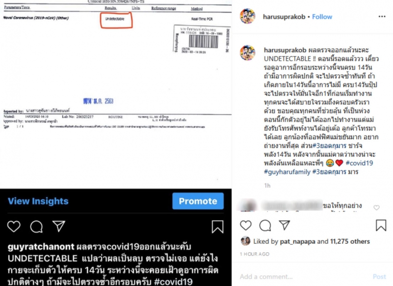 หลังจากนั้นฮารุก็ได้โพสต์อีกเช่นเดียวกันว่า ผลตรวจออกแล้วนะคะ UNDETECTABLE ตอนนี้รอดแล้ววว เดี๋ยวรอดูอาการอีกรอบระหว่างนี้จนครบ 14 วัน ถ้ามีอาการผิดปกติจะไปตรวจซ้ำทันที ถ้าเกิดภายใน 14 วันนี้อาการไม่มี ครบ 14 วัน ปุ้ปจะไปตรวจให้มั่นใจอีก1ทีก่อนเริ่มทำงาน ทุกคนจะได้สบายใจรวมถึงครอบครัวเราด้วย ขอบคุณทุกคนที่ช่วยลุ้น ที่เป็นห่วง ตอนนี้กักตัวอยู่ไม่ได้ออกไปทำงานแต่แม่ยังรับโทรศัพท์งานได้อยู่เด้อ ลูกค้าโทรมาได้เลย พนักงานที่ออฟฟิศแม่ขยันมาก อยากถ่ายงานที่สุด ส่วน3ยอดกุมาร ชาร์จพลัง 14 วัน หลังจากนั้นแม่คาดว่านางน่าจะพลังล้นเหลือแหละพี่ๆ
