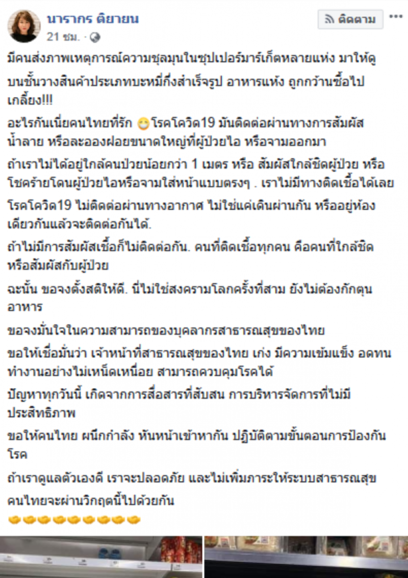 จากกรณีที่ดาราชื่อดัง แมทธิว ดีน ได้ออกมาประกาศว่าตนเองติด COVID ทำให้ประชาชนเกิดความแตกตื่นรีบหาซื้อของใช้ที่จำเป็นเพื่อกักตุน จนสินค้าภายในห้างสรรพาบางอย่างหมดเกลี้ยงชั้นวาง วันนี้ทางด้านผู้ประกาศข่าวชื่อดัง นารากร ก็ได้ออกมาเคลื่อนไหวเรื่องนี้ โดยได้โพสต์ภาพและข้อความที่ประชนชนกักตุนอาหารว่า มีคนส่งภาพเหตุการณ์ความชุลมุนในซุปเปอร์มาร์เก็ตหลายแห่ง มาให้ดู บนชั้นวางสินค้าประเภทบะหมี่กึ่งสำเร็จรูป อาหารแห้ง ถูกกว้านซื้อไปเกลี้ยง