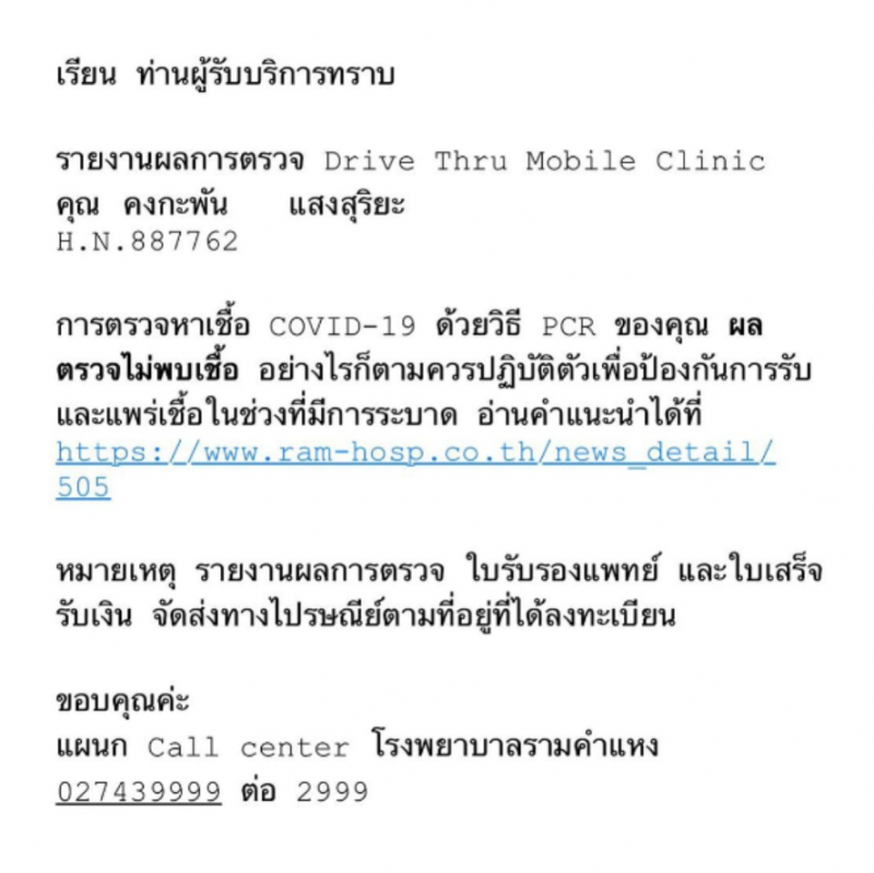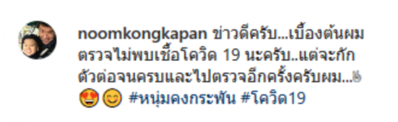 ล่าสุดทางด้าน หนุ่ม คงกระพัน ได้โพสต์ภาพผลตรวจของตนเองพร้อมระบุข้อความว่า ข่าวดีครับ เบื้องต้นผมตรวจไม่พบ COVID นะครับ แต่จะกักตัวต่อจนครบและไปตรวจอีกครั้งครับผม