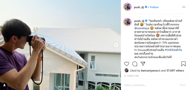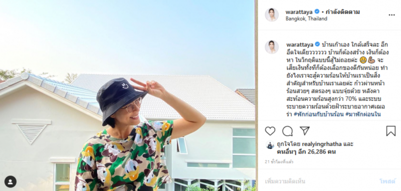 ส่วนทางด้านหนุ่มพุฒ ก็ได้โพสต์ภาพที่ฉากหลังเป็นหลังคาบ้านของตัวเอง พร้อมข้อความว่า ไม่เห็นหน้า เห็นหลังคาบ้านก็ยังดี ใกล้ความจริงแล้วที่รัก warattaya หลังคาสีเทาทุนดาร์ที่ตามหามานาน ถูกใจเฮียมาก อากาศร้อนแต่บ้านไม่ร้อน เพราะเฮียมีตัวช่วยทำให้บ้านเย็น
