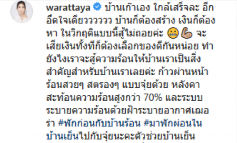 ล่าสุดทางด้านสาวจุ๋ย ได้โพสต์ภาพตัวเองที่ถ่ายรูปคู่กับหลังคาบ้านตัวเอง พร้อมข้อความว่า บ้านเก๊าเอง ใกล้เสร็จละ อีกอึดใจเดียว บ้านก็ต้องสร้าง เงินก็ต้องหา ในวิกฤติแบบนี้สู้ไม่ถอยค่ะ จะเสียเงินทั้งทีก็ต้องเลือกของดีกันหน่อย ทำยังไงเราจะสู้ความร้อนให้บ้านเราเป็นสิ่งสำคัญสำหรับบ้านเราเลยค่ะ ก้าวผ่านหน้าร้อนสวยๆ สตรองๆ แบบจุ๋ยด้วย หลังคาสะท้อนความร้อนสูงกว่า 70 เปอร์เซ็น และระบบระบายความร้อนด้วยฝ้าระบายอากาศเฌอร่า