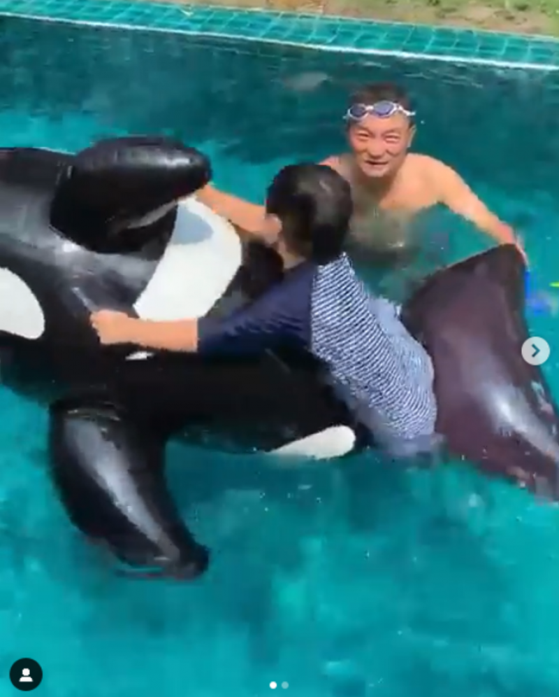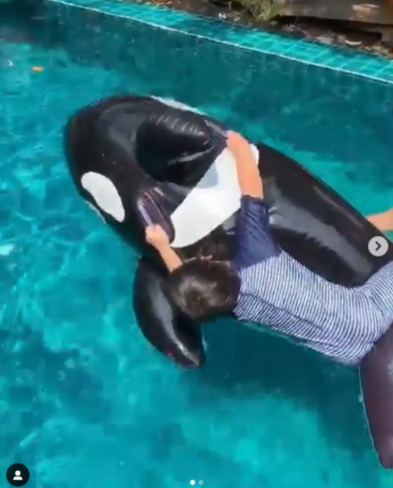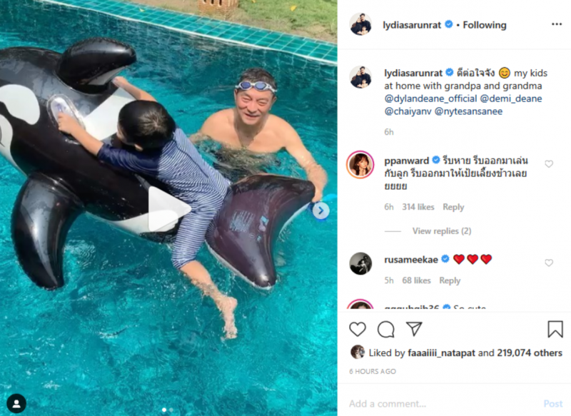 ล่าสุด สาวลิเดีย ได้โพสต์คลิป น้องดีแลนกำลังเล่นน้ำกับคุณตา และขึ้นหลังปลาโลมาตัวใหญ่ พร้อมโยกตัวไปมาอย่างสนุกสนาน ส่วนน้องเดมี่นั่งยิ้มดูพี่ดีแลนเล่นน้ำอยู่ขอบสระ เห็นแล้วต้องยิ้มตามแน่นอน โดยสาวลิเดียระบุข้อความว่า Verified ดีต่อใจจัง my kids at home with grandpa and grandma