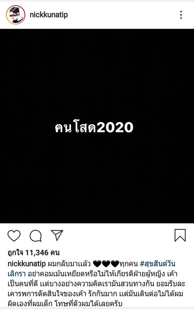 ทางด้านของ หนุ่มนิก ก็โพสต์ โสด 2020 พร้อมข้อความว่า ผมกลับมาแล้วทุกคน สุขสันต์สันเลิกราอย่าคอมเมนต์ไม่ให้เกียรติฝ่ายผู้หญิง เค้าเป็นคนที่ดีแต่บางอย่างความคิดเรามันสวนทางกันยอมรับละเคารพการตัดสินใจของเค้า รักกันมาก แต่มันเดินต่อไปไม่ได้ผมผิดเองที่ผมอายุน้อยกว่า โทษที่ตัวผมได้เลยครับ
