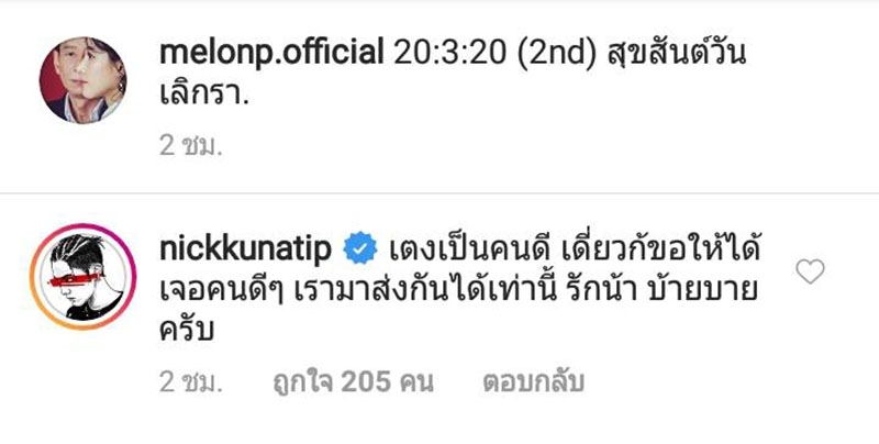 หลังจากนั้นไม่นาน หนุ่มนิก ได้เข้ามาคอมเมนต์ว่า เตงเป็นคนดี เดี๋ยวก็ขอให้ได้เจอคนดีๆ เรามาส่งกันได้เท่านี้ รักนะ บ้ายบายครับ