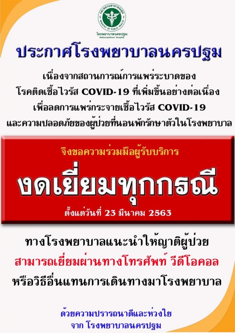 วันนี้ 22 มีนาคม 2563 โรงบาลนครปฐม ได้มีการประกาศระบุว่า เนื่องจากสถานการณ์การแพร่กระจายของ CO VID ที่เพิ่มขึ้นอย่างต่อเนื่อง เพื่อลดการแพร่กระจาย และความปลอดภัยของคนไข้ที่นอนพักรักษาตัวในโรงบาล ขอความร่วมมือผู้รับบริการงดเยี่ยมทุกกรณีตั้งแต่วันที่ 23 มีนาคม 2563 ทางโรงบาลแนะนำให้ญาติคนไข้สามารถเยี่ยมผ่านทางโทรศัพท์ วิดีโอคอล หรือวิธีอื่นแทนการเดินทางมาโรงบาล
