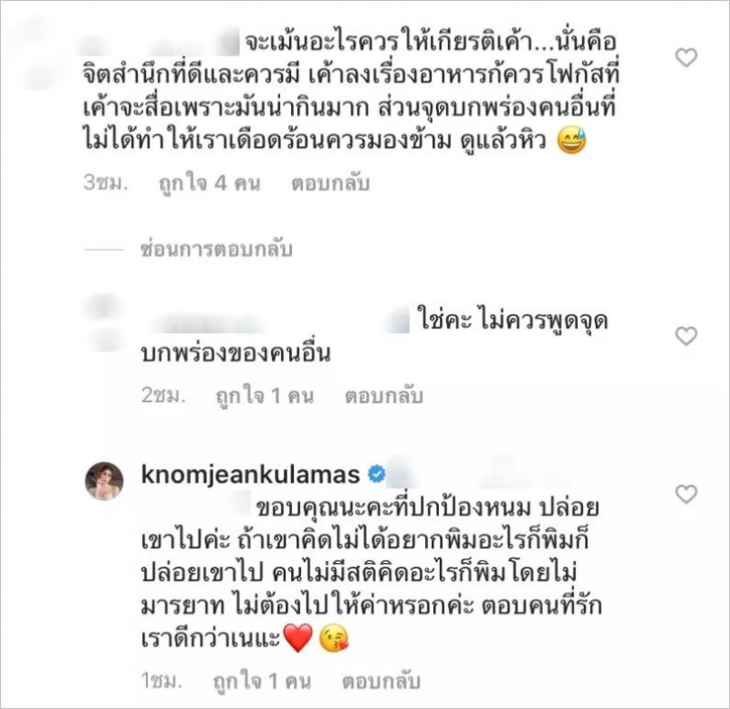 ต่อมา สาวขนมจีนก็ได้เข้ามาตอบกลับคอมเมนต์ว่า ขอบคุณนะคะที่ปกป้องหนม ปล่อยเขาไปค่ะ ถ้าเขาคิดไม่ได้อยากพิมอะไรก็พิมก็ปล่อยเขาไป คนไม่มีสติคิดอะไรก็พิมโดยไม่มีมารยาท ไม่ต้องไปให้ค่าหรอกค่ะ ตอบคนที่รักเราดีกว่าเนอะ