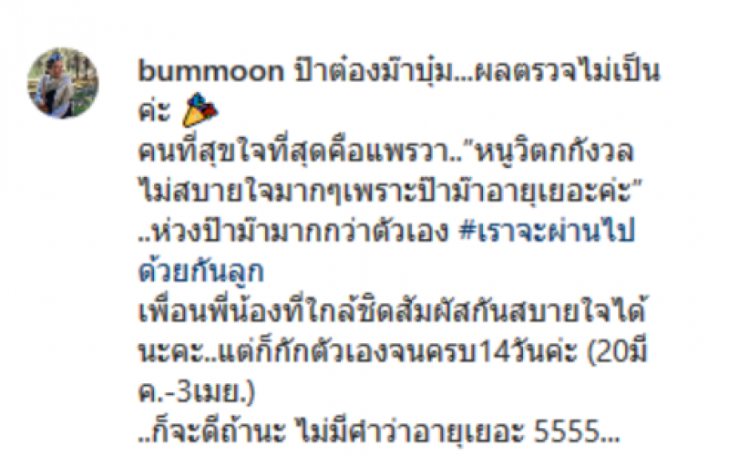 ล่าสุดในอินสตาแกรมของ คุณแม่ศศิธร ก็ได้ออกมาอัพเดทใบตรวจ CO VID ของคุณแม่และคุณพ่อของ พร้อมเล่าเรื่องความห่วงของสาวแพรวาให้ทุกคนทราบว่า ป๊าต๋องม๊าบุ๋ม ผลตรวจไม่เป็นค่ะ คนที่สุขใจที่สุดคือแพรวา หนูวิตกกังวลไม่สบายใจมากๆเพราะป๊าม๊าอายุเยอะค่ะ ห่วงป๊าม๊ามากกว่าตัวเอง เราจะผ่านไปด้วยกัน เพื่อนพี่น้องที่ใกล้ชิดสัมผัสกันสบายใจได้นะคะ แต่ก็กักตัวเองจนครบ14วันค่ะ 20 มีค ถึง 3 เมย ก็จะดีถ้านะ ไม่มีคำว่าอายุเยอะ