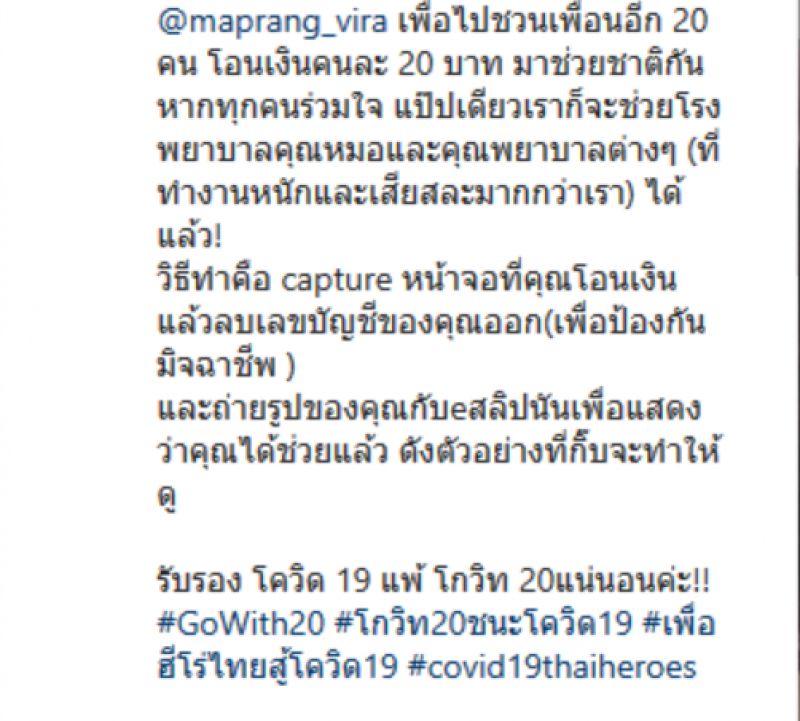 ถือเป็นแคมเปญที่ดี สำหรับแคมเปญ โกวิท 20 ที่ร่วมกันบริจาคเงิน 20 บาท แล้วชวนเพื่อนอีก 20 คน มาร่วมบริจาคไปเรื่อยๆ ถือว่าการบริจาคครั้งนี้ไม่เกินกำลังจนเกินไปสำหรับทุกคน