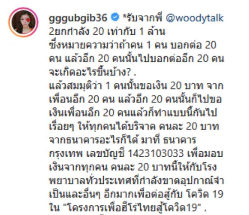 ล่าสุด กุ๊บกิ๊บ ได้โพสต์สลิปการโอนเงินจำนวน 20 บาท พร้อมข้อความว่า รับจากพี่ woodytalk 2ยกกำลัง 20 เท่ากับ 1 ล้าน ซึ่งหมายความว่าถ้าคน 1 คน บอกต่อ 20 คน แล้วอีก 20 คนนั้นไปบอกต่ออีก 20 คนจะเกิดอะไรขึ้นบ้าง แล้วสมมุติว่า 1 คนนั้นขอเงิน 20 บาท จากเพื่อนอีก 20 คน แล้วอีก 20 คนนั้นก็ไปขอเงินเพื่อนอีก 20 คน แล้วก็ทำแบบนี้กันไปเรื่อยๆ ให้ทุกคนได้บริจาค คนละ 20 บาท จากธนาคารอะไรก็ได้ มาที่ ธนาคารกรุงเทพ เลขบัญชี 1423103033 เพื่อมอบเงินจากทุกคน คนละ 20 บาทนี้ ให้กับโรงบาลทั่วประเทศที่กำลังขาดอุปกาณ์จำเป็นและอื่นๆอีกมาก