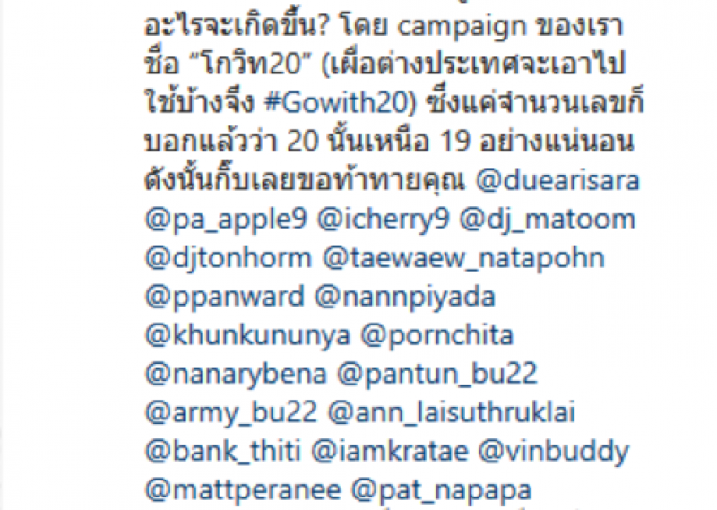 เพื่อต่อสู้กับ CO VID ในโครงการเพื่อฮีโร่ไทยสู้ CO VID อะไรจะเกิดขึ้น โดย campaign ของเราชื่อ โกวิท20 เผื่อต่างประเทศจะเอาไปใช้บ้างจึง Gowith20 ซึ่งแค่จำนวนเลขก็บอกแล้วว่า 20 นั้นเหนือ 19 อย่างแน่นอน