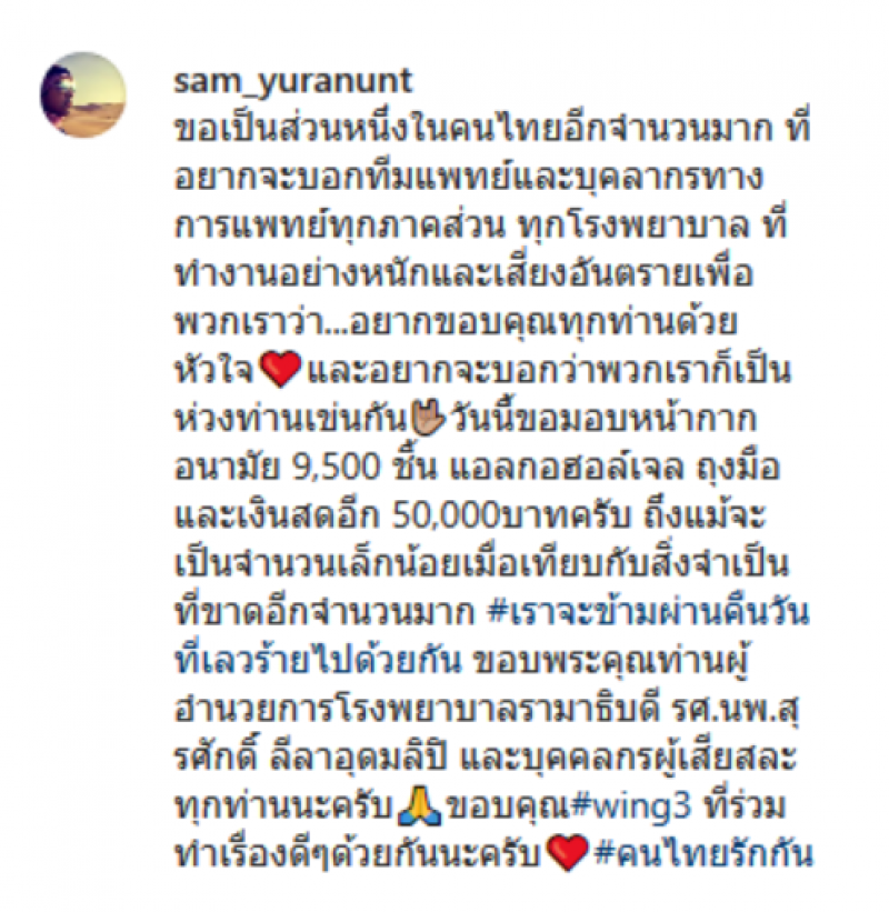 ล่าสุด แซม ยุรนันท์ ได้โพสต์ภาพและข้อความว่า ขอเป็นส่วนหนึ่งในคนไทยอีกจำนวนมาก ที่อยากจะบอกทีมแพทย์และบุคลากรทางการแพทย์ทุกภาคส่วน ทุกโรงบาลที่ทำงานอย่างหนักเพื่อพวกเราว่า อยากขอบคุณทุกท่านด้วยหัวใจ และอยากจะบอกว่าพวกเราก็เป็นห่วงท่านเช่นกัน วันนี้ขอมอบหน้ากากอนามัย 9500 ชิ้น เจล ถุงมือและเงินสดอีก 50000 บาทครับ ถึงแม้จะเป็นจำนวนเล็กน้อยเมื่อเทียบกับสิ่งจำเป็นที่ขาดอีกจำนวนมาก เราจะข้ามผ่านคืนวันที่ไม่ดีไปด้วยกัน