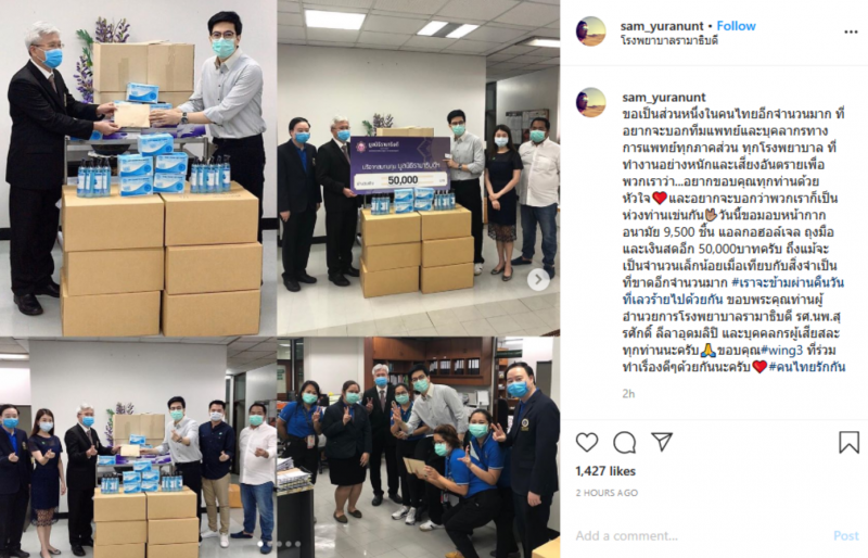 แซม ยุรนันท์ ร่วมบริจาคหน้ากากอนามัย 9500 ชิ้น เจล ถุงมือ และเงินสดอีก 50000 บาท กับมูลนิธิรามาธิบดี