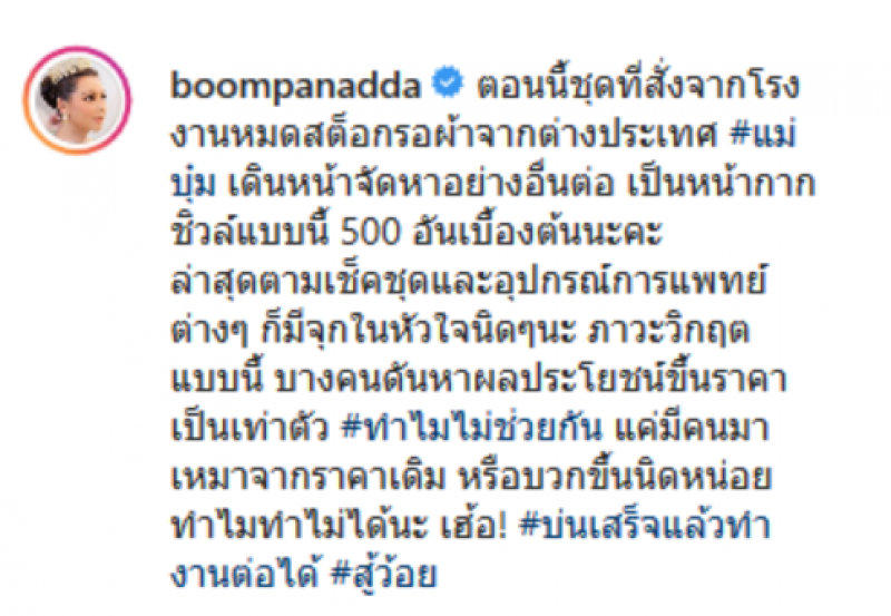 บุ๋ม ปนัดดา หาซื้อชุด PPE ให้แพทย์ไม่ได้ ราคาขึ้นเท่าตัว