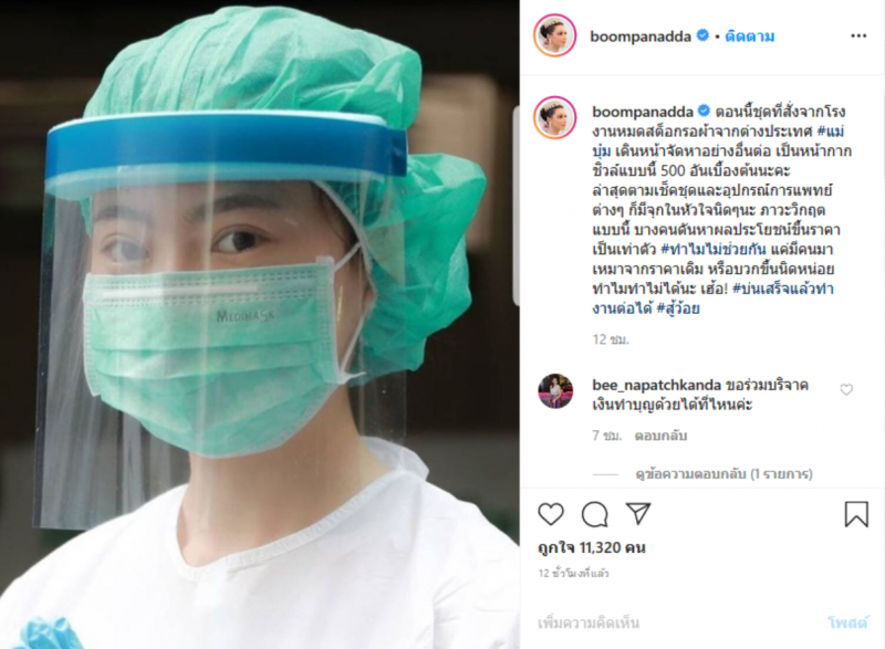 ซึ่งสาวบุ๋ม ได้โพสต์ตัวอย่างหน้ากากชิวล์ พร้อมข้อความว่า ตอนนี้ชุดที่สั่งจากโรงงานหมดสต็อกรอผ้าจากต่างประเทศ แม่บุ๋ม เดินหน้าจัดหาอย่างอื่นต่อ เป็นหน้ากากชิวล์แบบนี้ 500 อันเบื้องต้นนะคะ ล่าสุดตามเช็คชุดและอุปกรณ์การแพทย์ต่างๆ ก็มีจุกนิดๆนะ ภาวะวิกฤตแบบนี้ บางคนดันหาผลประโยชน์ขึ้นราคาเป็นเท่าตัว ทำไมไม่ช่วยกัน แค่มีคนมาเหมาจากราคาเดิม หรือบวกขึ้นนิดหน่อย ทำไมทำไม่ได้นะ เฮ้อ บ่นเสร็จแล้วทำงานต่อได้