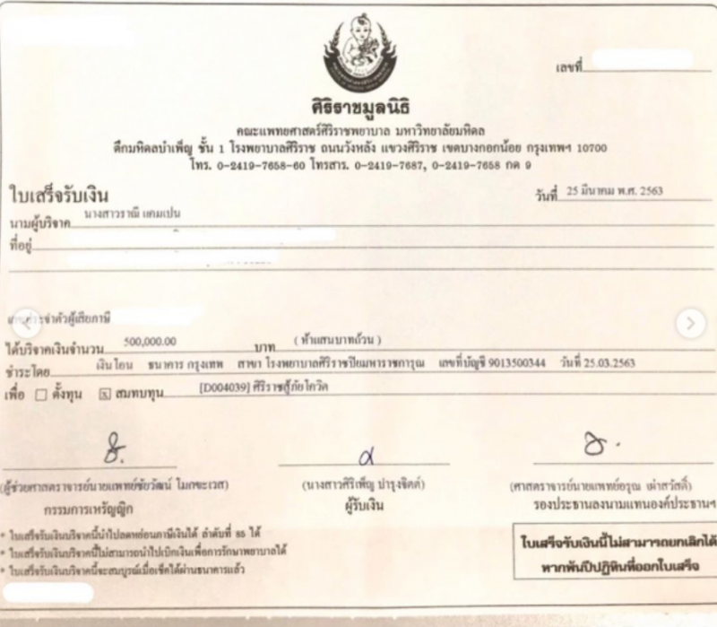 ศิริราชมูลนิธิ ศิริราชสู้ CO VID จำนวน 500000 บาท