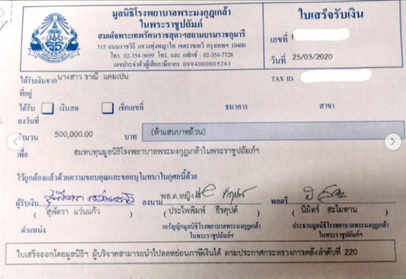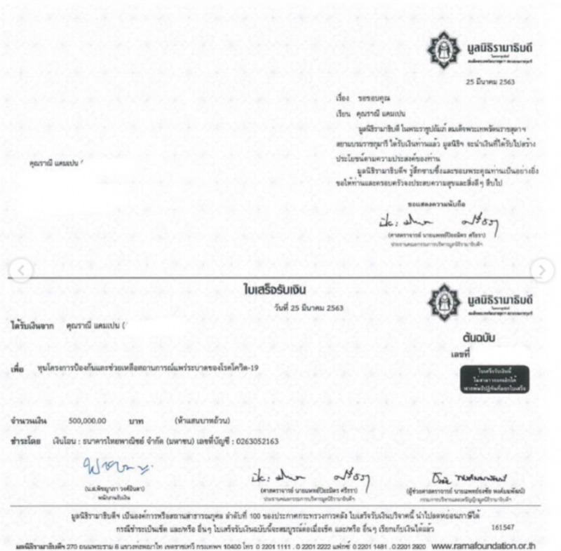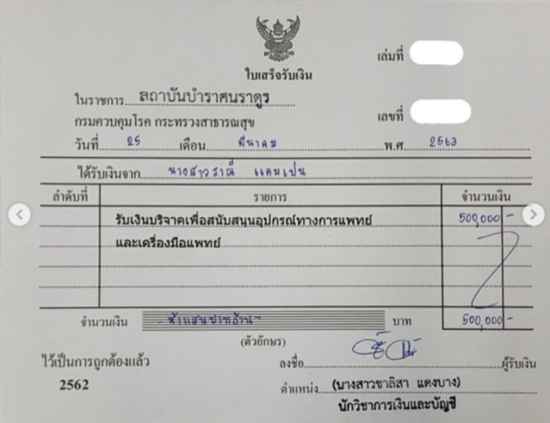 เงินบริจาคสำหรับสถาบันบำราศนราดูร จำนวน 500000 บาท
