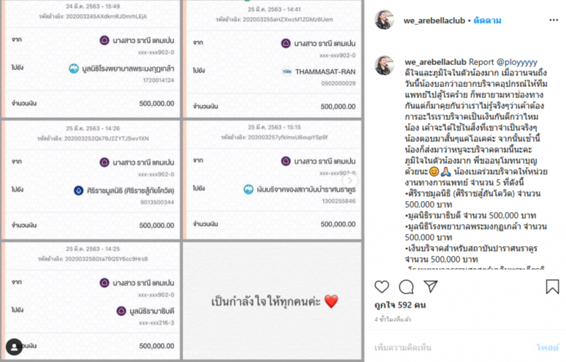 จำนวนเงินที่ เบลล่า บริจาคช่วยโรงบาล 5 แห่ง สู้ COVID