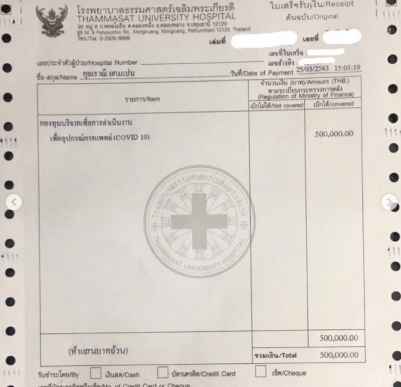โรงบาลธรรมศาสตร์เฉลิมพระเกียรติ กองทุนบริจาค จำนวน 500000 บาท