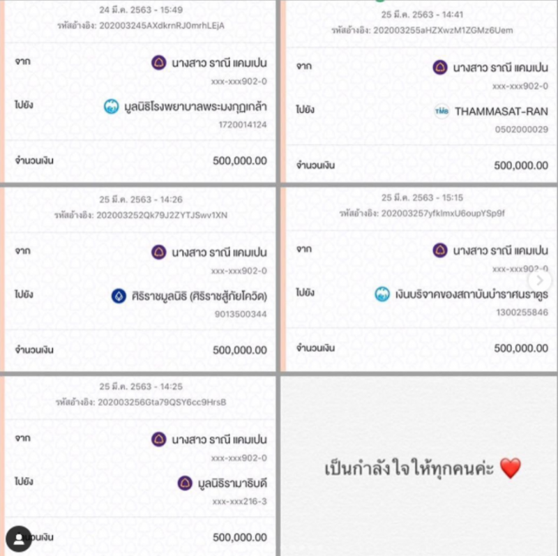 เรียกได้ว่าเป็นนางเอกสาวที่สวยแล้วยังใจบุญอีกต่างหากสำหรับ เบลล่า ราณี แคมเปน อีกหนึ่งคนดังในวงการบันเทิงที่ได้ช่วยเป็นกำลังใจให้ บุคลากรการแพทย์และหน่วยงานที่เกี่ยวข้อง จากผลกระทบการแพร่กระจายของ CO VID ด้วยการบริจาคเงินส่วนตัว 2 จุด 5 ล้านบาท ให้กับหน่วยงานทางการแพทย์ทั้งหมด 5 สถานที่ เนื่องจากจำนวนผู้ติด CO VID ที่เพิ่มมากขึ้น และอุปกรณ์ทางการแพทย์ยังคงมีไม่เพียงพอต่อบุคลกรทางการแพทย์ที่ใช้ในการดูแล