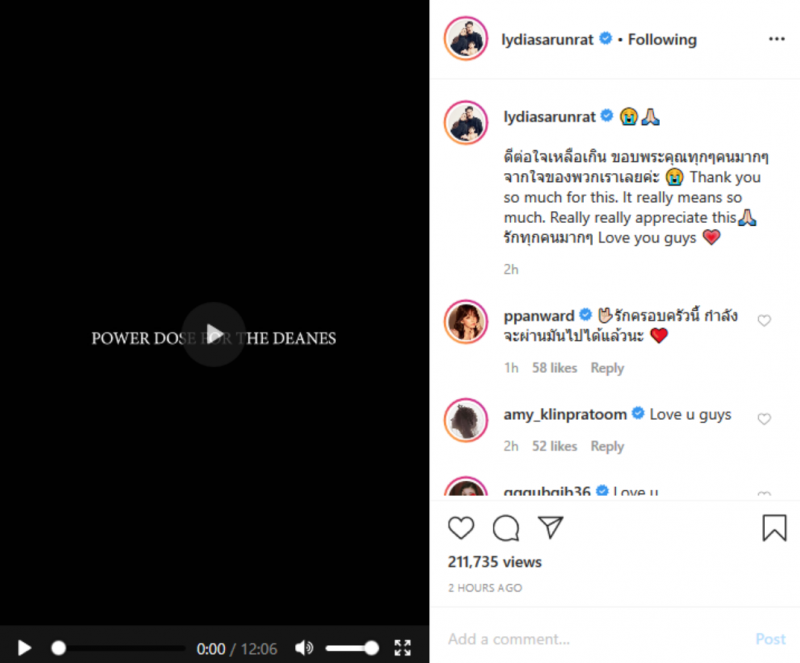 ล่าสุดสาวลิเดีย มีคลิปกำลังใจจากเพื่อนๆในวงการบันเทิง ที่อวยพรให้ลิเดีย และแมทธิว หายเป็นปกติกลับมาอยู่กับน้องดีแลน น้องเดมี่เร็วๆ โดยสาวลิเดียได้โพสต์คลิปพร้อมข้อความว่า ดีต่อใจเหลือเกิน ขอบพระคุณทุกๆคนมากๆจากใจของพวกเราเลยค่ะ Thank you so much for this It really means so much Really really appreciate this รักทุกคนมากๆ Love you guys