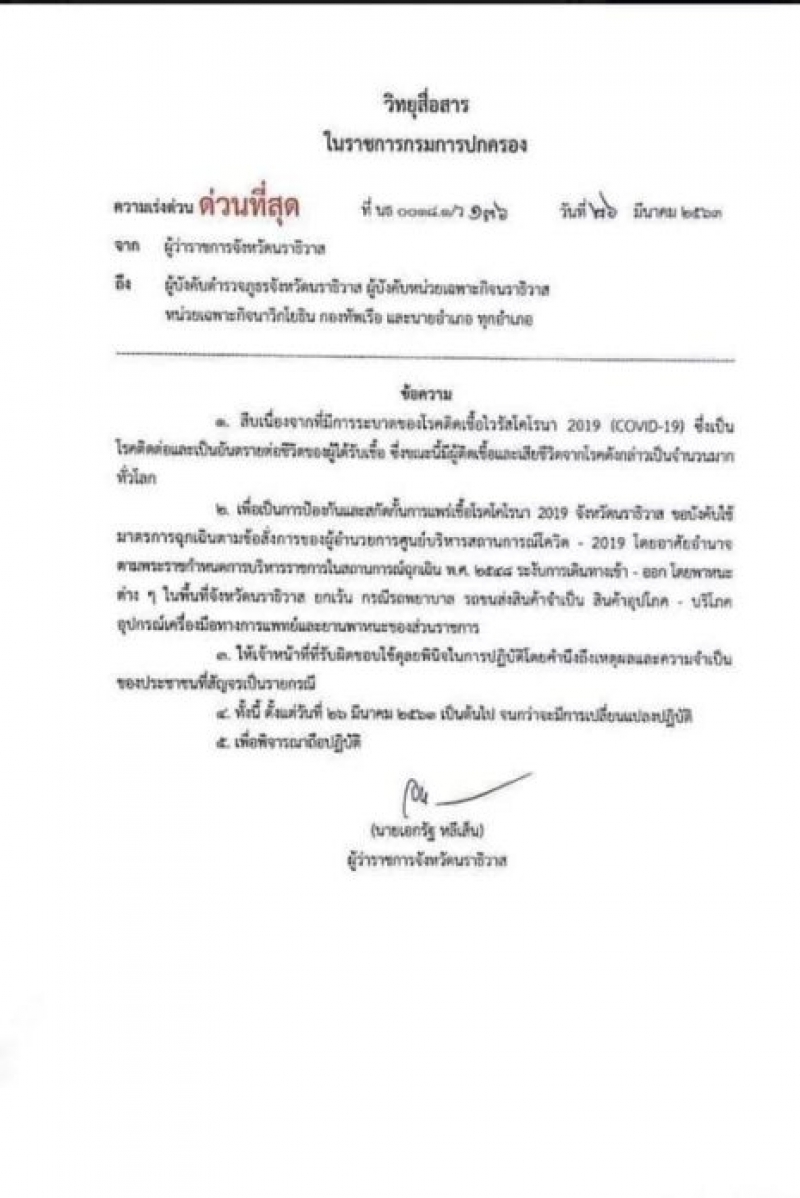 ผู้ว่าฯ ออกหนังสือด่วนที่สุดสั่งปิดจังหวัดนราธิวาส