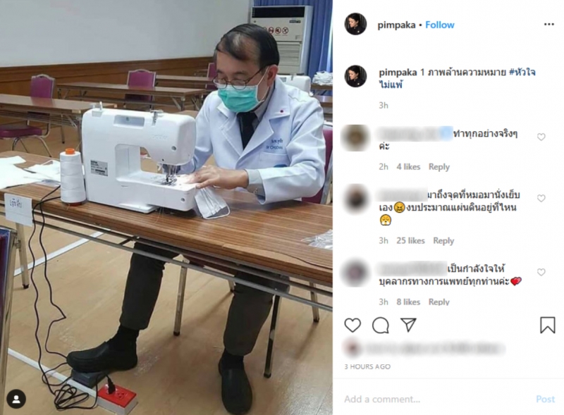 วันนี้ได้มีภาพคุณหมอท่านหนึ่งที่นั่งเย็บหน้ากากอนามัยถูกเผยแพร่ทั่วโซเชียล ทำให้มีการพูดถึงมากมาย รวมถึงดาราดัง หมู พิมพ์ผกา ก็ได้ออกมาโพสต์ภาพประทับใจเมื่อคุณหมอกำลังนั่งเย็บหน้ากากอนามัยด้วยตัวเอง พร้อมเเคปชั่นว่า 1 ภาพล้านความหมาย หัวใจไม่แพ้ ทำเอาแฟนคลับเข้ามาแสดงความคิดเห็นกันมากมาย