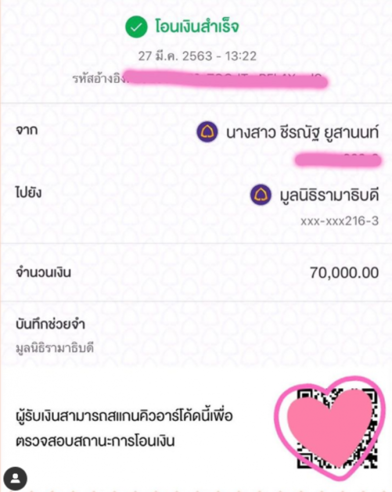 เป็นอีกหนึ่งดาราในวงการบันเทิง ที่ร่วมบริจาคเงินเพื่อช่วยเหลือผู้ป่วยจาก CO VID