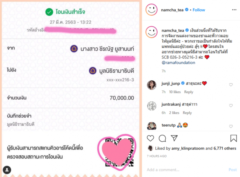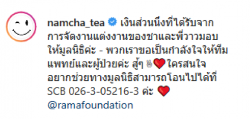 ซึ่งสาวน้ำชา ได้โพสต์ภาพสลิปการโอนเงิน 7 หมื่นบาท ที่เป็นเงินส่วนหนึ่งที่ได้รับจากซองในงานแต่ง มอบให้กับมูลนิธิรามาธิบดี พร้อมข้อความว่า เงินส่วนนึงที่ได้รับจากการจัดงานแต่งงานของชาและพี่วาวมอบให้มูลนิธิค่ะ พวกเราขอเป็นกำลังใจให้ทีมแพทย์และผู้ป่วยค่ะ สู้ๆ