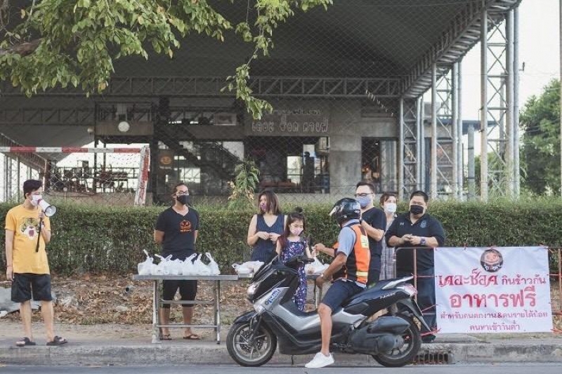 ด้วยการจัดทำข้าวกล่อง เพื่อแจกฟรีให้กับผู้ที่มีรายได้น้อย ผู้ที่ตกงาน รวมไปถึงผู้ที่ได้รับผลกระทบจากสถานการณ์ จำนวนวันละ 150 กล่อง เป็นเวลา 3 วัน ณ ร้านเดอะช็อคข้าวต้มผี สนามฟุตบอลคริสตัล และถนนหลักบริเวณใกล้เคียง ซึ่งงานนี้นอกจากเราจะได้เห็นภาพน้ำใจของพี่น้องประชาชนที่มีให้แก่กันในช่วงเวลาที่ยากลำบากแล้ว เรายังได้รับรู้ถึงความรักและความสามัคคีที่คนไทยมีให้แก่กันอีกด้วย