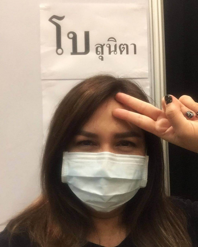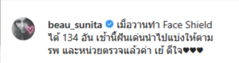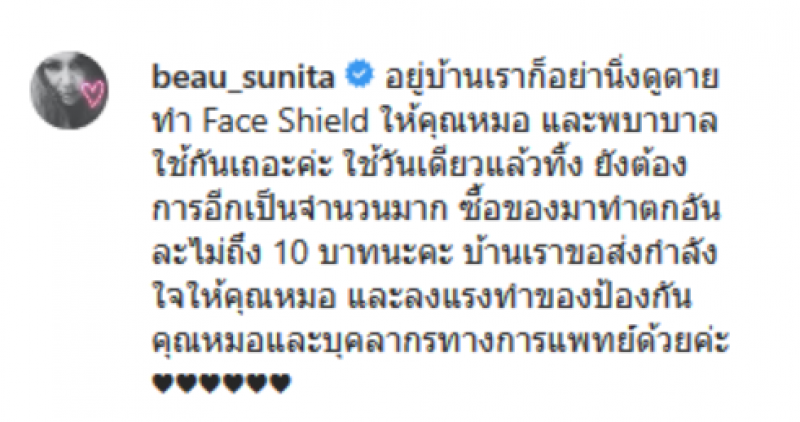 โดยสาวโบ สุนิตา ระบุข้อความว่า อยู่บ้านเราก็อย่านิ่งดูดาย ทำ Face Shield ให้คุณหมอ และพบาบาลใช้กันเถอะค่ะ ใช้วันเดียวแล้วทิ้ง ยังต้องการอีกเป็นจำนวนมาก ซื้อของมาทำตกอันละไม่ถึง 10 บาทนะคะ บ้านเราขอส่งกำลังใจให้คุณหมอ และลงแรงทำของป้องกันคุณหมอและบุคลากรทางการแพทย์ด้วยค่ะ
