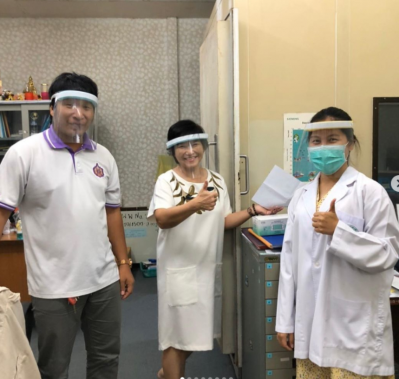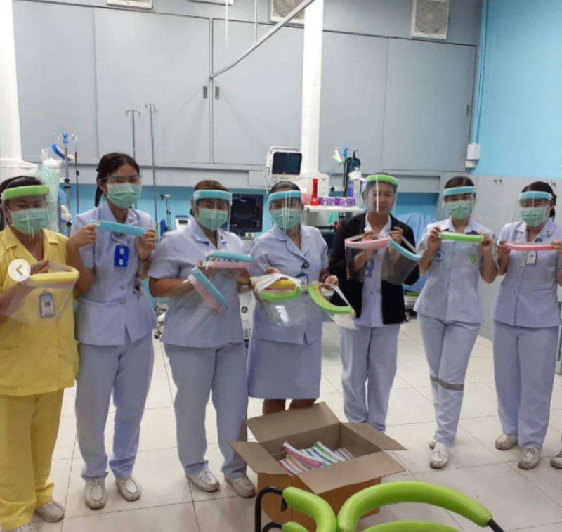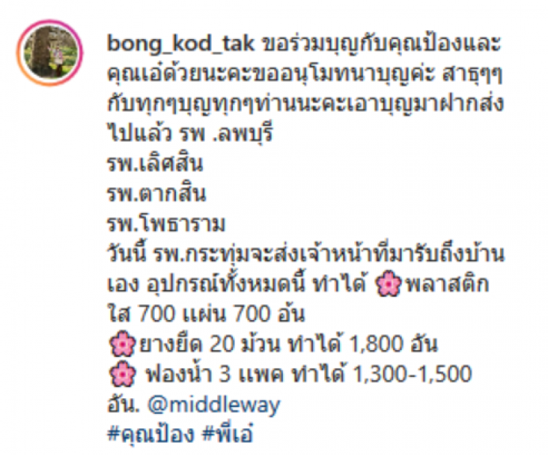 และยังได้ร่วมบริจาคหน้ากากป้องกันเชื้อ พร้อมข้อความว่า ขอร่วมบุญกับคุณป้องและคุณเอ๋ด้วยนะคะขออนุโมทนาบุญค่ะ สาธุๆกับทุกๆบุญทุกๆท่านนะคะเอาบุญมาฝากส่งไปแล้ว โรงพยาบาลลพบุรี โรงพยาบาลเลิศสิน โรงพยาบาลตากสิน โรงพยาบาลโพธาราม วันนี้โรงพยาบาลกระทุ่มจะส่งเจ้าหน้าที่มารับถึงบ้านเอง อุปกรณ์ทั้งหมดนี้ ทำได้ พลาสติกใส 700 เเผ่น 700 อ้น ยางยืด 20 ม้วน ทำได้ 1800 อัน ฟองน้ำ 3 เเพค ทำได้ 1300 ถึง 1500 อัน