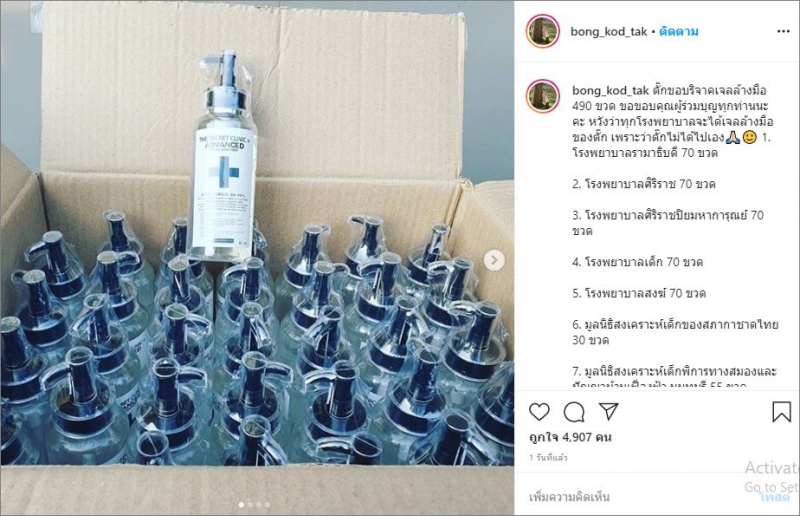 ล่าสุดสาวตั๊ก ได้มอบเจลล้างมือให้กับโรงพยาบาลและสถานที่ต่างๆ เป็นจำนวน 490 ขวด โดยโพสต์ภาพพร้อมข้อความลงอินสตาแกรมว่า ตั๊กขอบริจาคเจลล้างมือ 490 ขวด ขอขอบคุณผู้ร่วมบุญทุกท่านนะคะ หวังว่าทุกโรงพยาบาลจะได้เจลล้างมือของตั๊ก เพราะว่าตั๊กไม่ได้ไปเอง