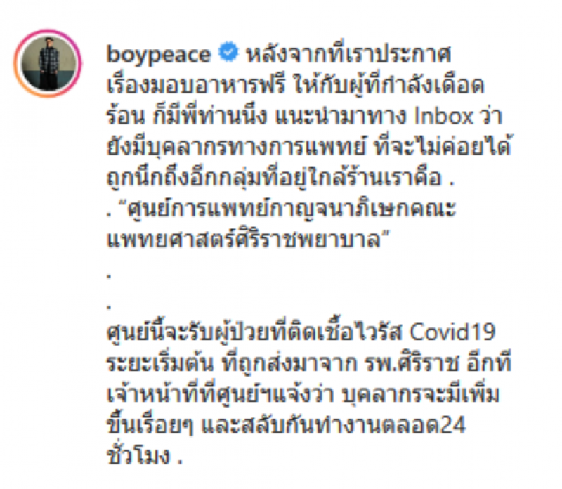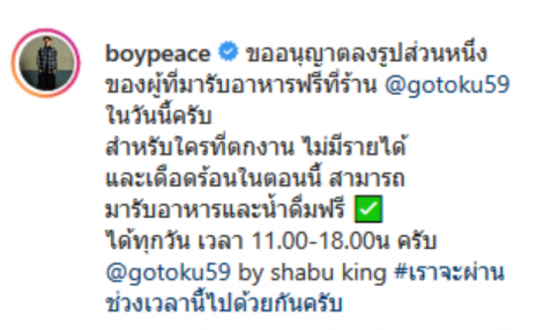 โดยหนุ่มบอยได้โพสต์ข้อความลงอินสตาแกรมส่วนตัวว่า ขออนุญาตลงรูปส่วนหนึ่ง ของผู้ที่มารับอาหารฟรีที่ร้าน gotoku59 ในวันนี้ครับ สำหรับใครที่ตกงาน ไม่มีรายได้ และเดือดร้อนในตอนนี้ สามารถมารับอาหารและน้ำดื่มฟรี ได้ทุกวัน เวลา 11 00 ถึง 18 00น ครับ เราจะผ่านช่วงเวลานี้ไปด้วยกันครับ