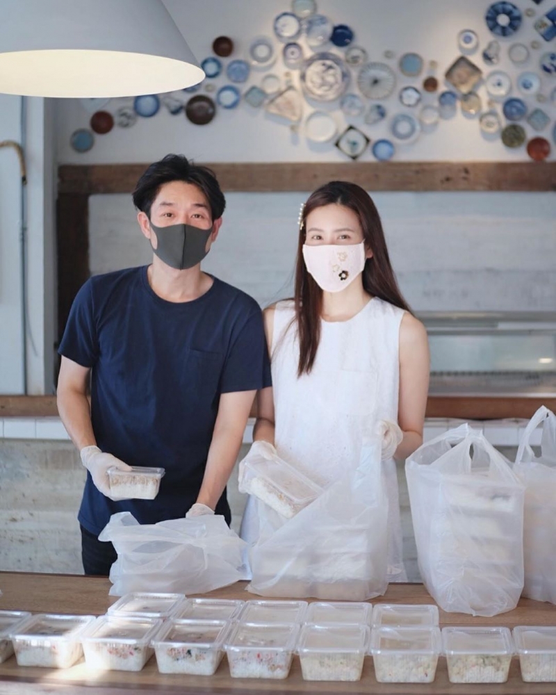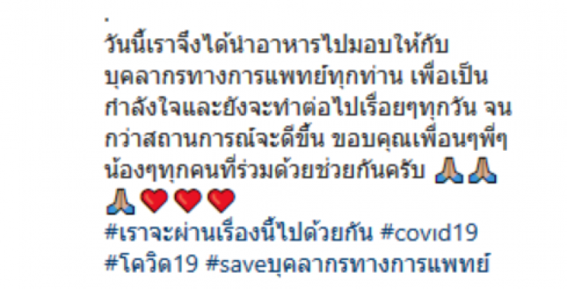 ล่าสุดทั้งคู่ได้ทำอาหารแจกทีมบุคลากรแพทย์ โดยโพสต์ภาพลงอินสตาแกรมพร้อมข้อความว่า หลังจากที่เราประกาศ เรื่องมอบอาหารฟรี ให้กับผู้ที่กำลังเดือดร้อน ก็มีพี่ท่านนึง แนะนำมาทาง Inbox ว่ายังมีบุคลากรทางการแพทย์ ที่จะไม่ค่อยได้ถูกนึกถึงอีกกลุ่มที่อยู่ใกล้ร้านเราคือ ศูนย์การแพทย์กาญจนาภิเษกคณะแพทยศาสตร์ศิริราชพยาบาล ศูนย์นี้จะรับผู้ป่วยที่ติด CO VID ระยะเริ่มต้น ที่ถูกส่งมาจาก รพ ศิริราช อีกที เจ้าหน้าที่ที่ศูนย์ฯแจ้งว่า บุคลากรจะมีเพิ่มขึ้นเรื่อยๆ และสลับกันทำงานตลอด24ชั่วโมง