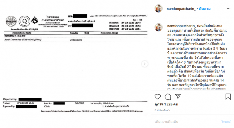 ทางฝนและพี่อาร์ม จึงได้ไปตรวจเพื่อหาCO VID กับทางโรงพยาบาลรามาธิบดี เมื่อวันที่ 27 มีนาคม ซึ่งตอนนี้ทราบผลแล้ว คือ ฝนและพี่อาร์ม ไม่พบ CO VID แต่เพื่อความปลอดภัย ฝนและพี่อาร์มจะกักตัวเองต่อ จนครบ 14 วัน และ ขอเชิญชวนให้พี่ๆน้องๆที่รักทุกคน ร่วมกันอยู่บ้านเพื่อลดความเสี่ยงด้วยกันนะคะ