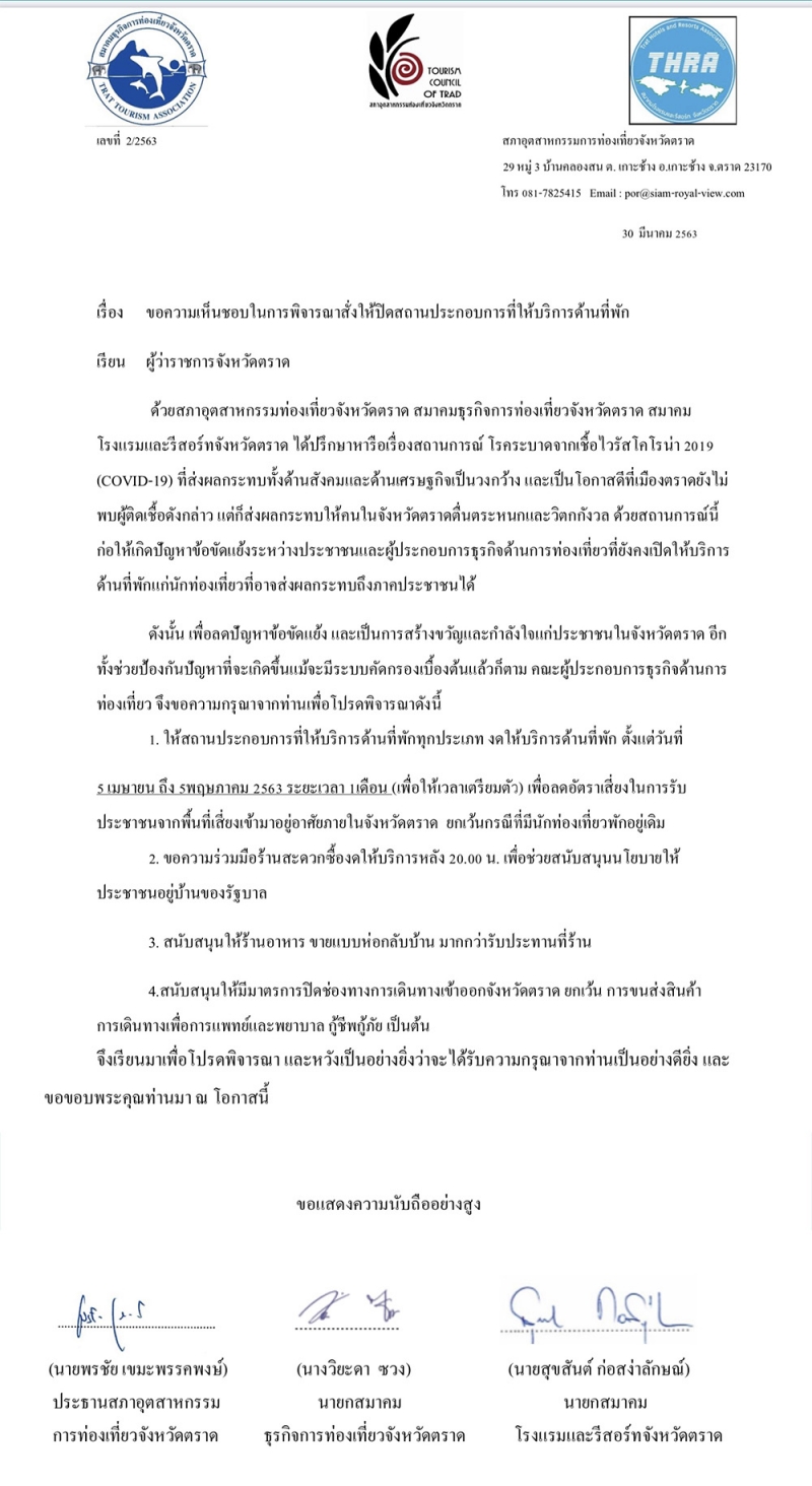 จากการที่ สภาอุตสาหกรรมท่องเที่ยวจังหวัดตราด สมาคมธุรกิจการท่องเที่ยวจังหวัดตราด สมาคม โรงแรมและรีสอร์ทจังหวัดตราด ที่เป็นองค์กรเอกชนด้านการท่องเที่ยวของจังหวัดตราด ได้ปรึกษาหารือเรื่องสถานการณ์โรคระบาดจากเชื้อ CO VID ที่ส่งผลกระทบทั้งด้านสังคมและด้านเศรษฐกิจเป็นวงกว้าง