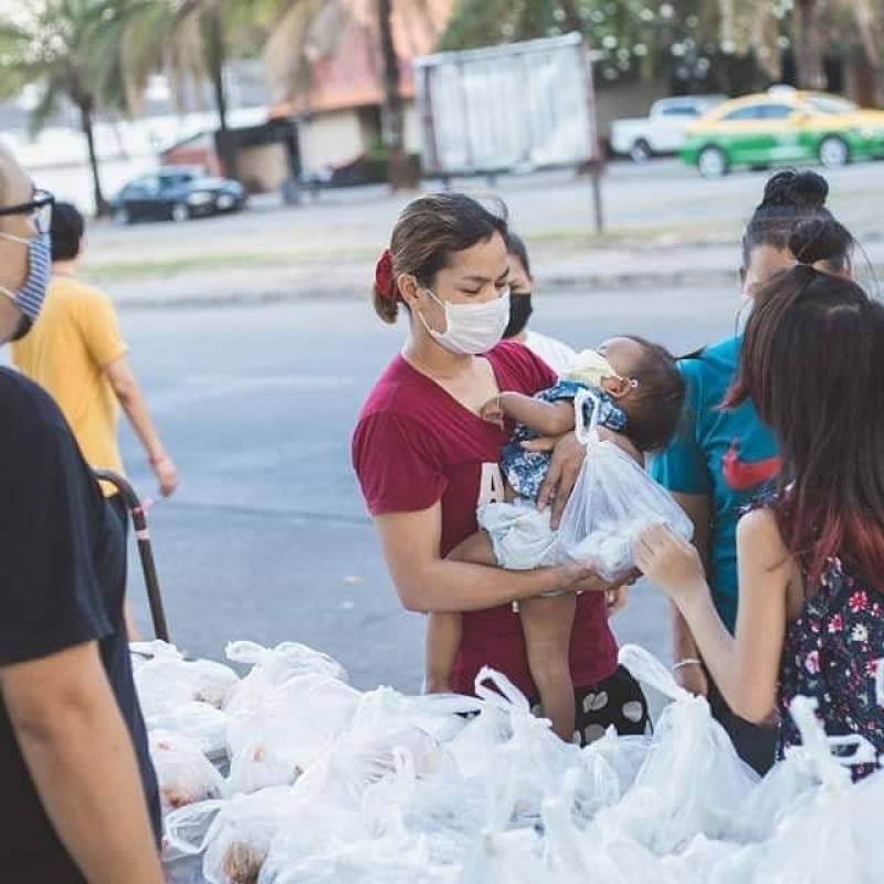 นอกจากจะแจกอาหารให้กับประชาชนทั่วไปแล้ว ยังแจกหน้ากากอนามัยให้ใช้ฟรีๆกันด้วย