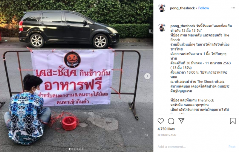 สถานการณ์การแพร่กระจายของ CO VID ในตอนนี้เพิ่มมากขึ้นทุกวัน ส่งผลกระทบต่อธุรกิจหลายๆอย่าง จนเกิดปัญหาการตกงาน ว่างงาน จึงมีผู้ใจบุญและเหล่าดาราทำอาหารแจกฟรีสำหรับผู้มีรายได้น้อย รวมถึง ป๋อง กพล กับเหล่าเพื่อนๆ จากเดอะช็อค ที่ร่วมแจกอาหารเย็นให้บุคคลทั่วไปฟรี โดยเริ่มตั้งแต่วันที่ 30 มีนาคม ที่ผ่านมา จนถึงวันที่ 11 เมษายน ซึ่งนอกจากข้าวแล้ว ยังมีหน้ากากอนามัยแจกอีกด้วย