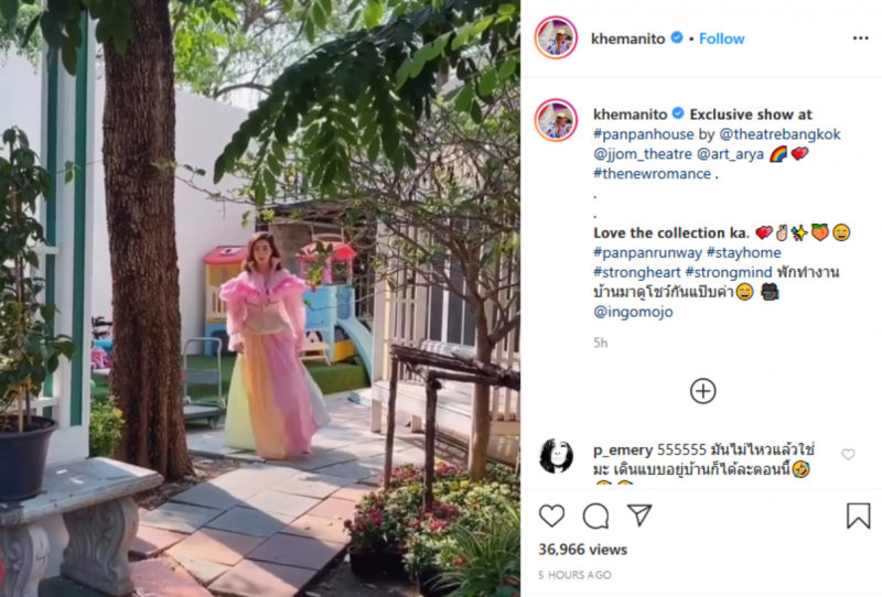 เนื่องจากสถานการณ์การแพร่ระบาดของ Co VID ที่กำลังวิกฤตอยู่ในขณะนี้ ส่งผลกระต่อหลายธุรกิจรวมถึงคนบันเทิงที่ตองยกเลิกงานทั้งหมดอยู่บ้าน เพื่อลดความเสี่ยงในการแพร่กระจายของ CO VID ทำให้ แพนเค้ก เขมนิจ จามิกรณ์ นางเอกและนางแบบชื่อดัง เกิดอาการคิดถึงงานที่คุ้นเคย งานนี้เลยถือโอกาสเปลี่ยนสวนหน้าบ้าน เป็นแคทวอล์คซะเลย โดยสาวแพนเค้ก ได้โพสต์คลิปที่เจ้าตัวสับขาเดิน พร้อมระบุข้อความว่า พักทำงานบ้านมาดูโชว์กันแป๊บค่ะ