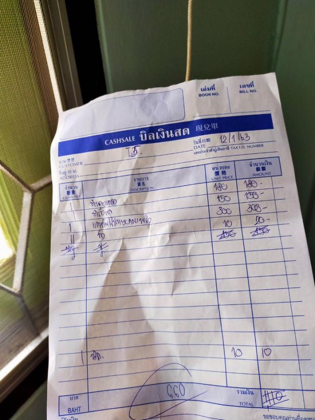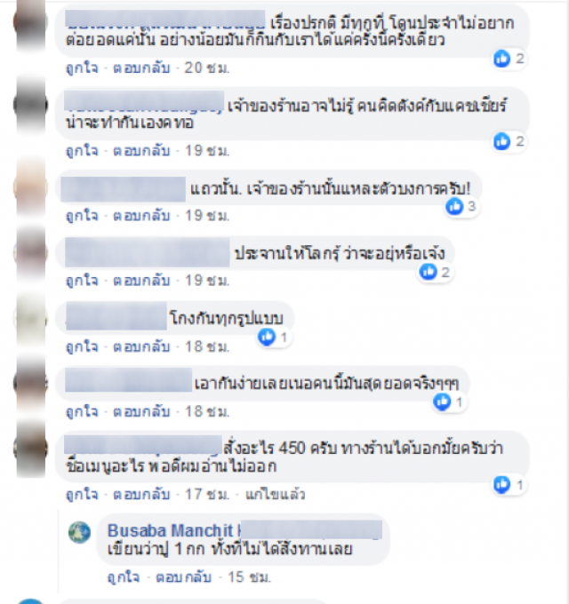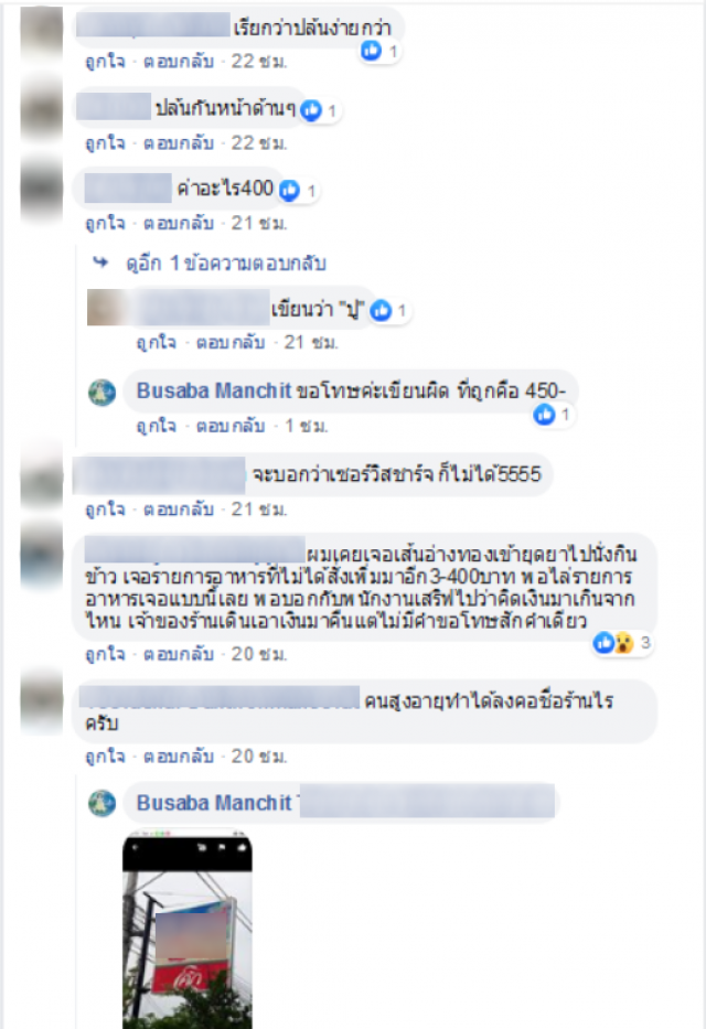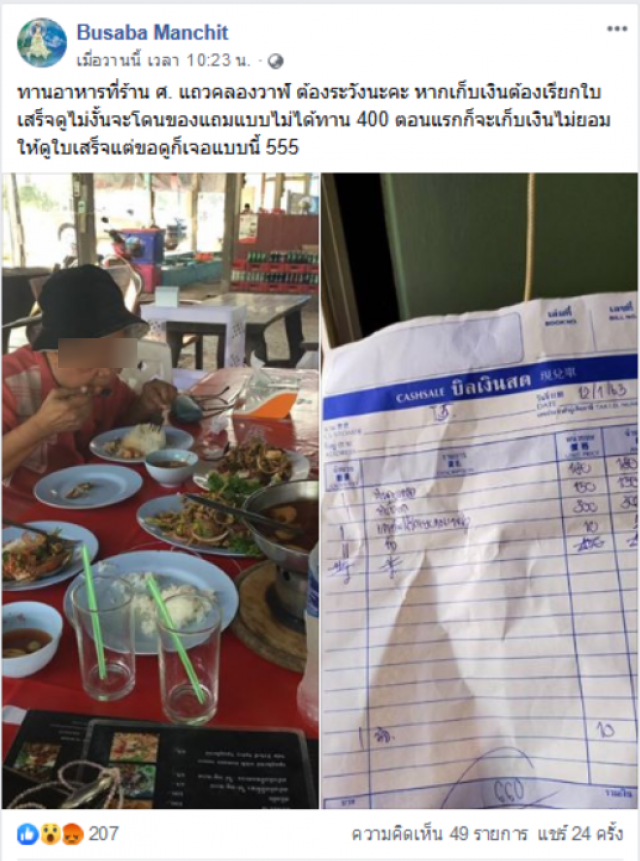 กลายเป็นเรื่องราวที่สร้างความแปลกใจให้กับผู้ที่พบเห็นและชาวโซเชียลเป็นจำนวนมาก เมื่อได้มีผู้ใช้เฟซบุ๊ค Busaba Manchit ได้โพสต์เรื่องราวว่า เธอและครอบครัวได้ไปทานอาหารที่ร้านอาหารแห่งหนึ่ง ซึ่งเธอก็สั่งกับข้าวทั้งหมด 4 อย่าง พอทานเสร็จเธอก็เรียกพนักงานเก็บเงิน ปรากฏว่าราคาทั้งหมด 1110 เธอรู้สึกว่ามันแพงกว่าปกติ จึงขอดูใบบิล ซึ่งในบิลนี้มีการขีดค่ารายการอาหารออกไป 1 อย่างมีมูลค่า 450 ซึ่งเธอไม่ได้สั่ง ซึ่งเหตุการณ์ดังกล่าวสร้างความไม่พอใจให้เธอเป็นอย่างมาก จึงได้โพสต์ภาพพร้อมข้อความใจความว่า