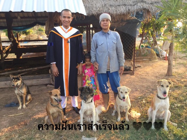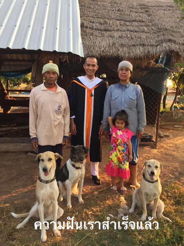หนุ่มใส่ชุดครุย ถ่ายรูปกับพ่อแม่และสุนัขสุดรัก หลังเรียนจบภายใน 2 ปีครึ่ง