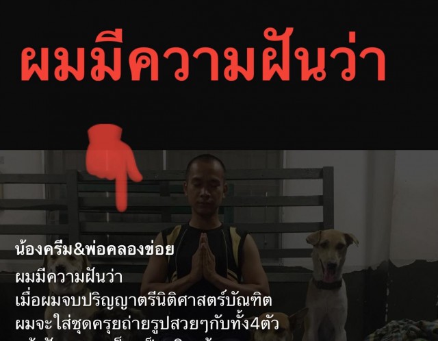 ฝันของผมเป็นจริงแล้วนะครับFc ขอบคุณคุณพ่อคุณแม่ ขอบคุณครูบาอาจารย์ ขอบคุณคนรักผม ขอบคุณFC ทุกคน ผมจบ ป ตรีใบนี้เป็นใบที่2 นิติศาสตร์ มหาลัยรามคำแหง ผมใช้เวลาเรียน2ปีครึ่ง ในวันรับจริงแม่กับพ่อผมไม่สามารถ ไปร่วมแสดงความยินดีได้ที่ กทม ผมจึงนำชุดครุยมาถ่ายรูปท่าน และน้องหมาของผม