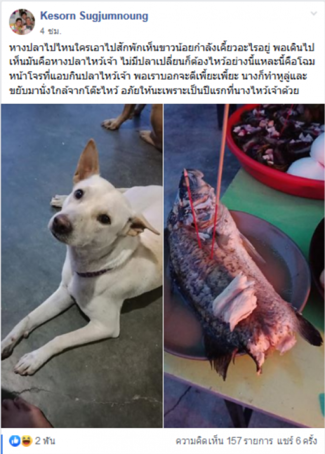 หางปลาไปไหนใครเอาไปสักพักเห็นขาวน้อยกำลังเคี้ยวอะไรอยู่ พอเดินไปเห็นมันคือหางปลาไหว้เจ้า ไม่มีปลาเปลี่ยนก็ต้องไหว้อย่างนี้แหละนี้คือโฉมหน้าโจรที่แอบกินปลาไหว้เจ้า พอเราบอกนางก็ทำหูลู่และขยับมานั่งใกล้จากโต๊ะไหว้ อภัยให้นะเพราะเป็นปีแรกที่นางไหว้เจ้าด้วย